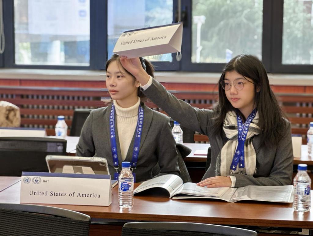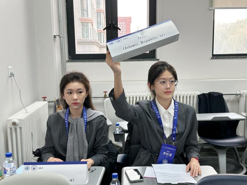 此次大会开设了“联合国大会第一委员会(UNGA1)”“联合国大会第三委员会(UNGA3)”“联合国教科文组织(UNESCO)”等七个会场。我们石睿妮、劳雅怡同学代表美国在“联合国大会第一委员会(UNGA1)”讨论——巴以冲突的和平解决方案;骆欣谊、李姣潼同学代表为伊朗在“联合国大会第三委员会(UNGA3)”讨论——战乱冲突地区的难民安置与流离失所者的人权保障。她们与来自北京师范大学、北京外国语大学、国防科技大学等知名高校学子共同探讨了国际热点问题,发挥创造性思维,进行批判性思考,寻求全球性问题的解决方案。