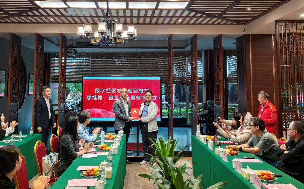 敦聘仪式伊始,数字经贸学院院长李广明教授详细介绍了廖继勇先生和曾昱先生的职业背景和学术成就。在热烈的掌声中,刘少波副校长代表学校向廖继勇先生和曾昱先生颁发新伟德国际1946客座教授聘书。廖继勇先生在受聘感言中分享了对未来合作的展望,表达了对教育事业的热忱和对学院发展的期待。