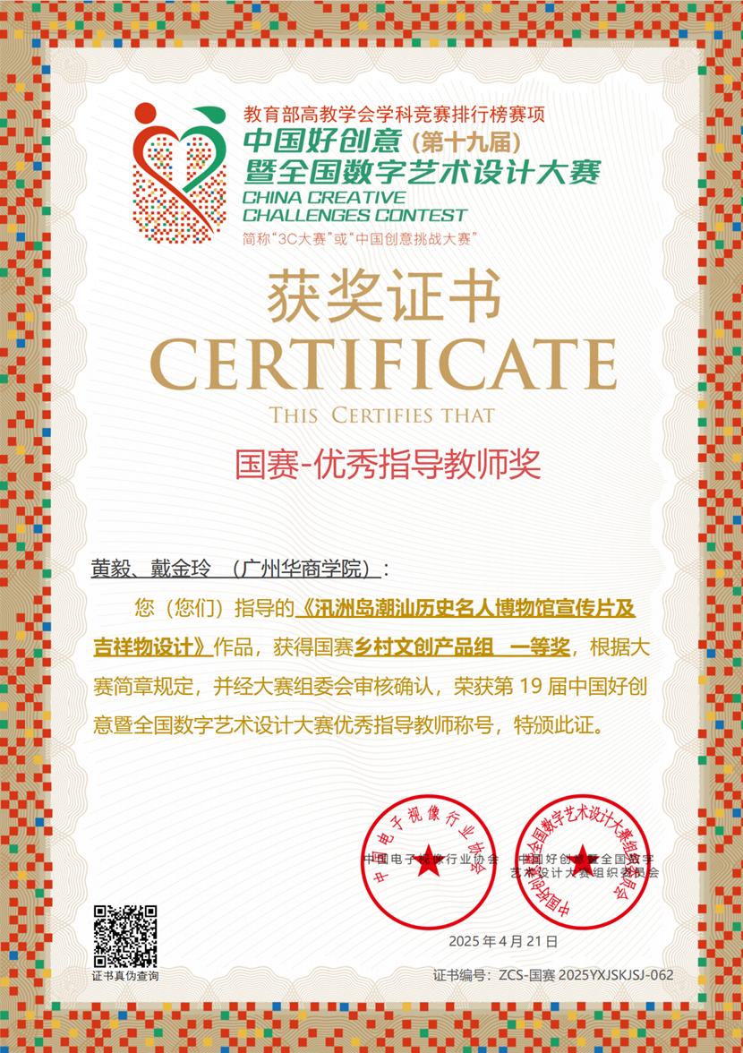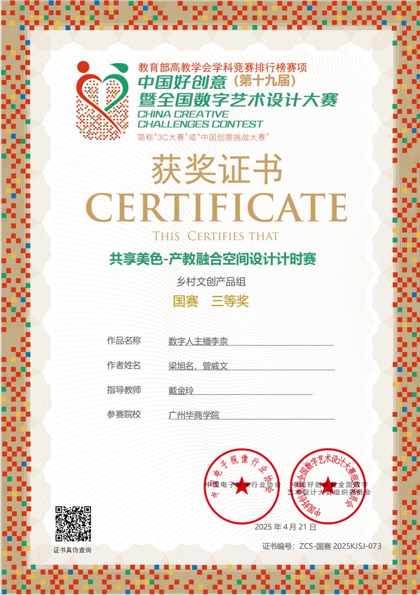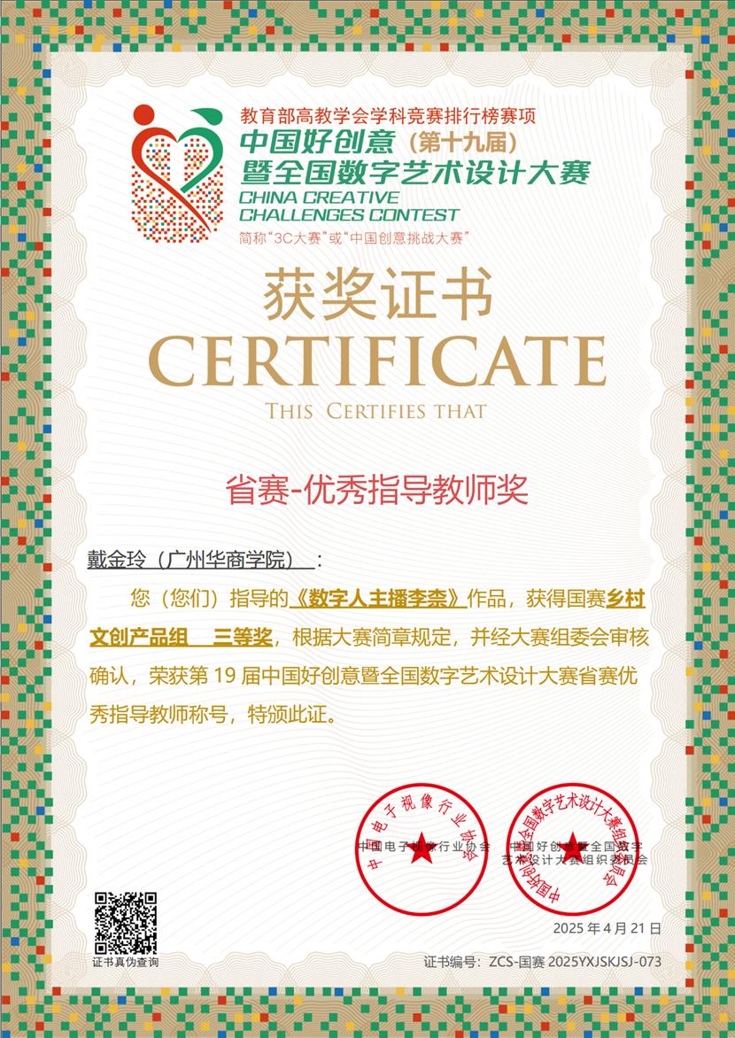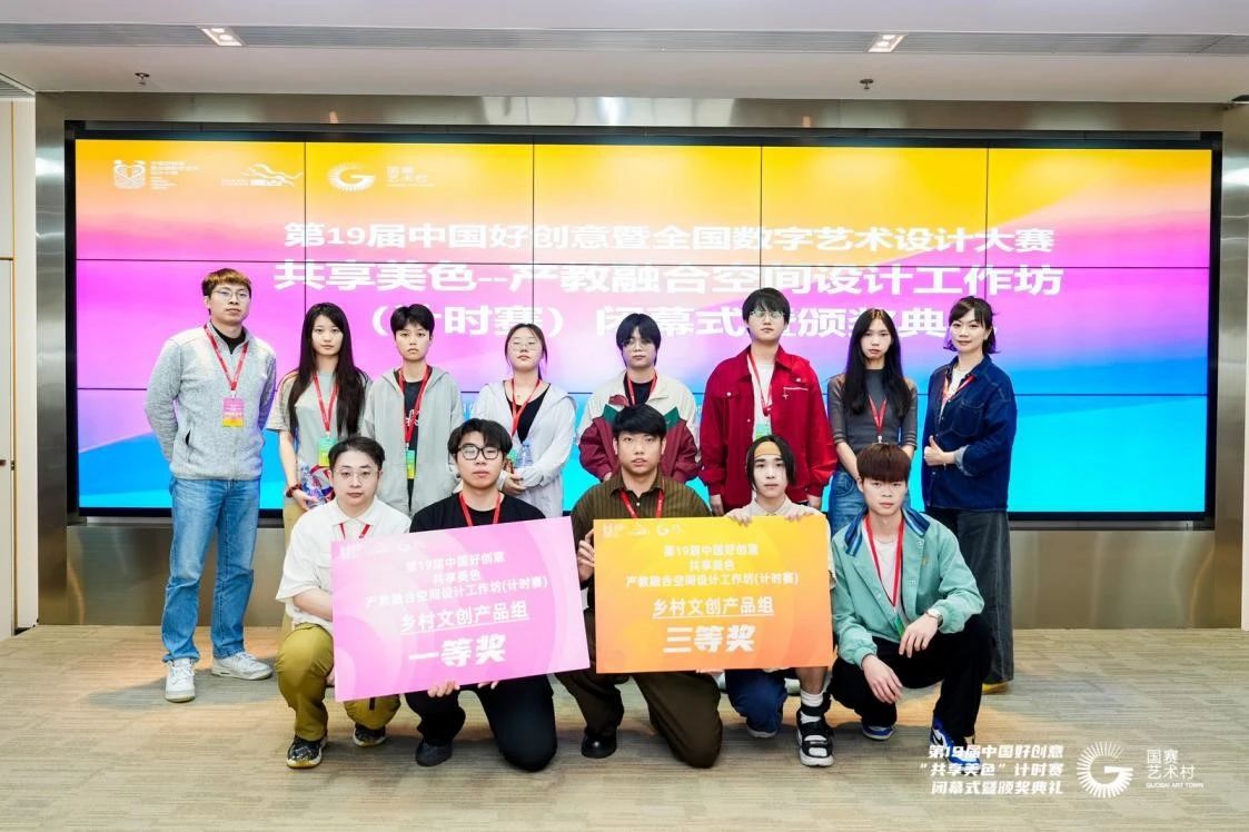 第十九届中国好创意暨全国高校数字艺术设计大赛国赛村基地活动“共享美色——产教融合空间设计工作坊”于2025年4月9日至13日在佛山市南海区狮山镇国赛村圆满收官。视频传播系主任戴金玲老师与黄毅老师、企业导师熊玉才共同指导,带领动画专业11名学子首次参加48小时AIGC赛道,实现零的突破。在48小时云端鏖战中,团队依托AIGC智能设计平台,最终在“乡村振兴”专项组斩获国家级一等奖1项、三等奖1项,以“AI创作设计+文化传承”的创新范式,体现出我们应用型人才培养的实践性。