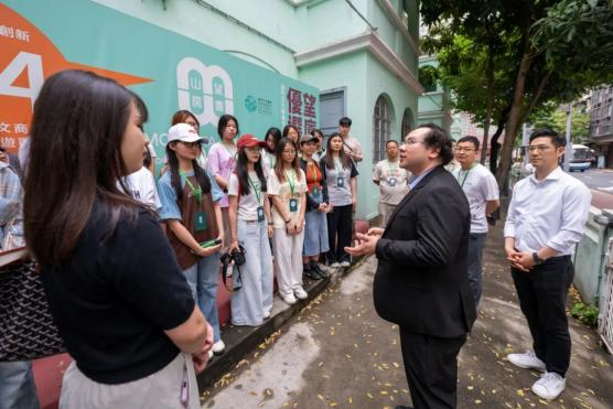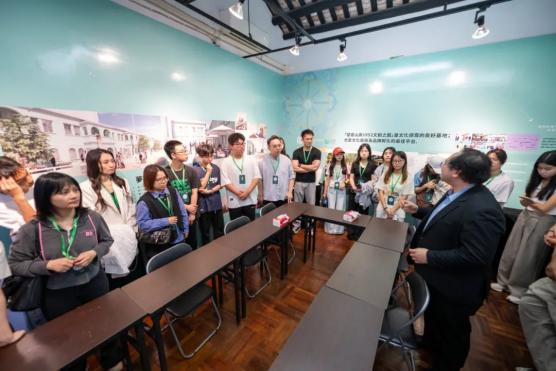 望厦山房项目负责人杨洪伟先生热情接待我们研学团队,围绕园区“以文塑旅、以旅彰文”的创新运营模式展开系统介绍。他结合建筑改造实践,重点解析了历史建筑活化利用,即通过融合传统工艺与现代技术,完整保留建筑历史风貌与文化基因,创新性植入文创市集、数字展陈等业态,构建文化遗产保护与商业价值转化的动态平衡机制,实现历史文物从静态展示到活态叙事的转变。通过展示园区将大三巴牌坊元素转化为系列数字藏品的典型案例,生动演绎政策赋能与技术创新如何协同驱动文化遗产的现代转译,令师生们直观理解文保活化项目中“守正”与“创新”的辩证关系。