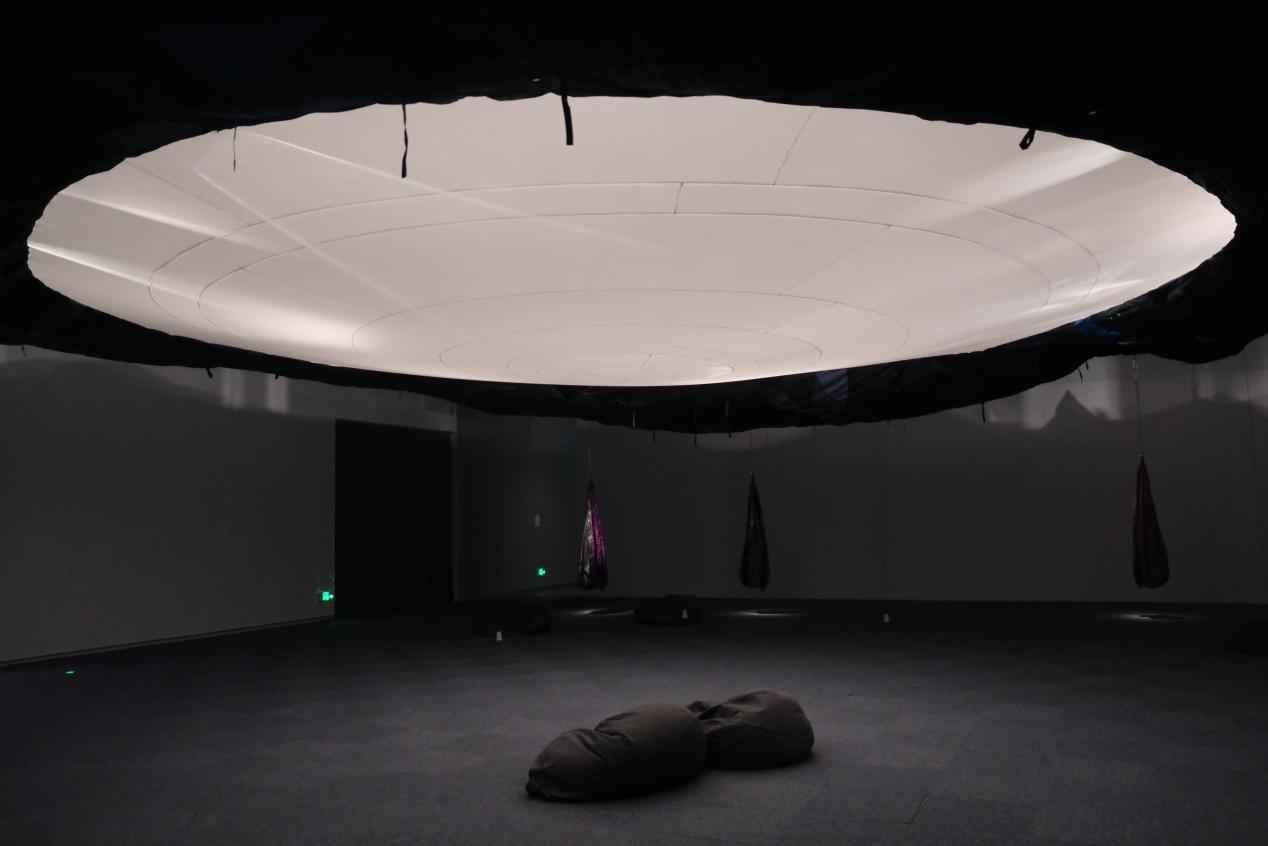 林岚作为中国香港当代艺术重要艺术家之一,长期关注社会中受忽视群体,以独特艺术创作将城市闲置物转化为艺术语言,如回收布料、工业推车等,构建当代社会异托邦,暗含内外世界对称关系。同学们在参观中,感受艺术作品如何通过装置、光影等形式传递社会思考。就如本次展览空间的核心——“同一滴泪下”,由香港与广东两地制衣女工共同缝制而成,同学们可在其中轻哼一段思乡歌曲,或在听筒中倾听陌生人的声音,这里成为了公众对话、理解的新起点,启发大家在新媒体写作中,突破传统文字表达框架,尝试融合多元艺术元素,拓宽内容呈现与传播的视角。