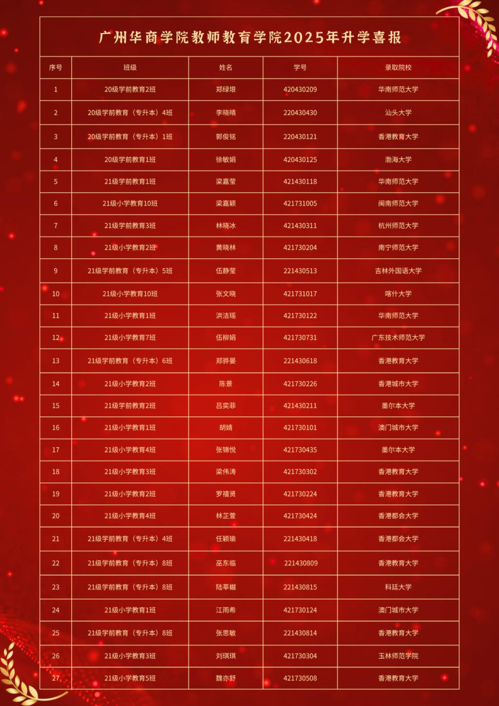 新伟德国际1946教师教育学院2025年毕业生考研再获佳绩。自建院以来,学院深耕学风建设,学子奋发向上。截至目前,教师教育学院2025届毕业生中共有27名同学被知名高校录取,特此向他们表示热烈祝贺!