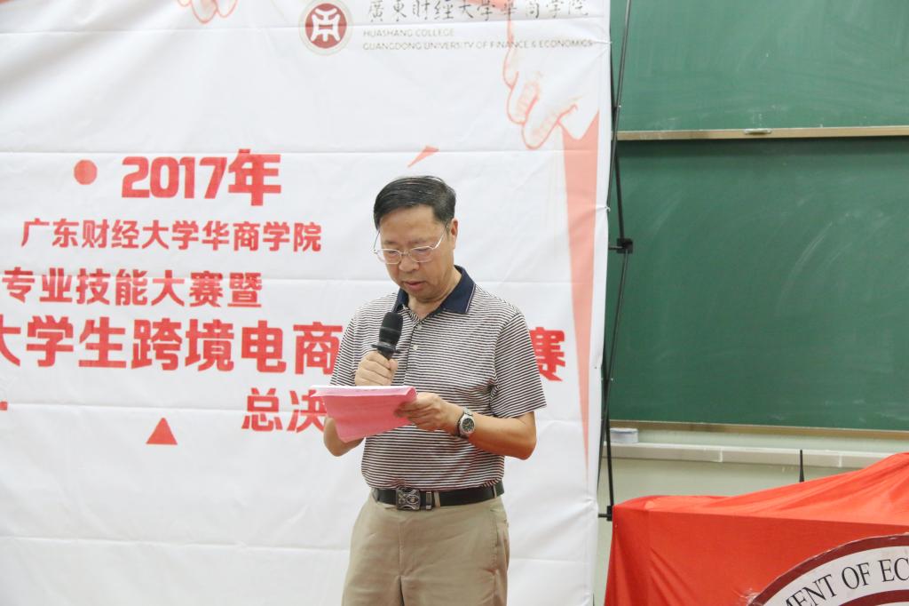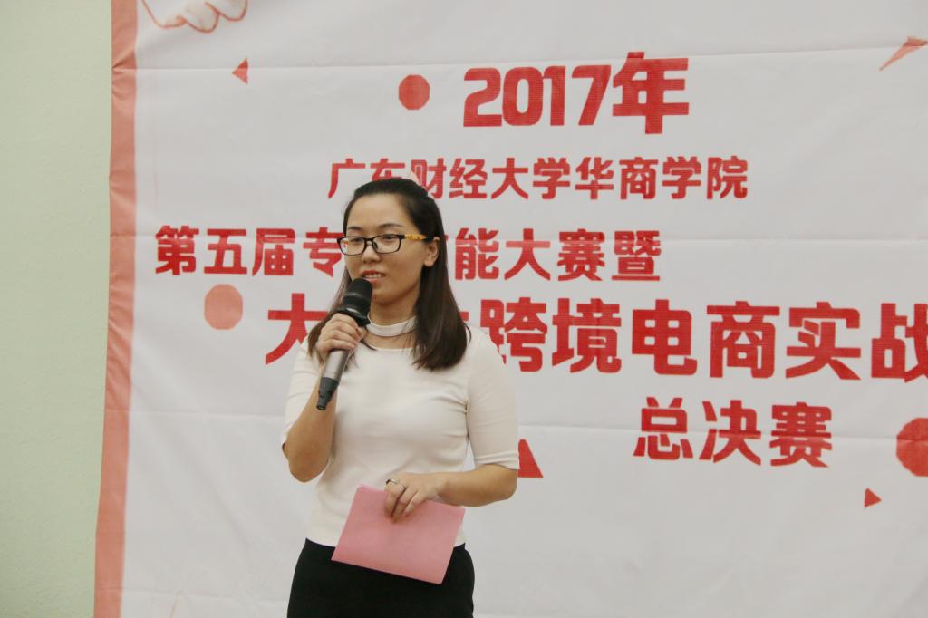 不忘初心,携手电商,圆创业之梦。经济与金融系于2017年9月26日14:30在励志楼D208举行了第五届专业技能大赛暨大学生跨境电商实战大赛总决赛。莅临本次大赛的嘉宾有广东财经大学华商学院郭银华副院长,经济与金融系王德高主任、张真副主任、邱会锋副主任,教务处实践科陈宏敏科长,经济管理学院办公室王海燕主任,贝斯特电子科技有限公司企业代表涂总,广州市津冠纸品有限公司企业代表严总,广州市毅盟硅橡胶科技有限公司企业代表周总,广州市增城科栎达塑料制品厂企业代表唐总,彤鑫电商产业园有限公司企业代表夏总监,广州市正茂印刷有限公司企业代表倪经理。