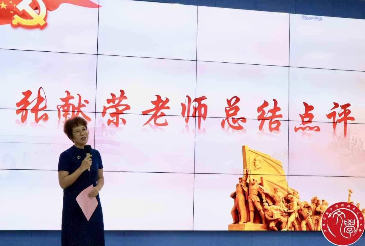 张献荣老师对本次决赛进行了点评。她指出,此次红色经典作品诵读活动主题鲜明、内容丰富、亮点纷呈,参赛选手结合自身人文专业知识,创新了比赛形式,展现了百年党史的辉煌壮阔。张老师还从专业的层面指出了选手们的优缺点,鼓励同学们练好口才。