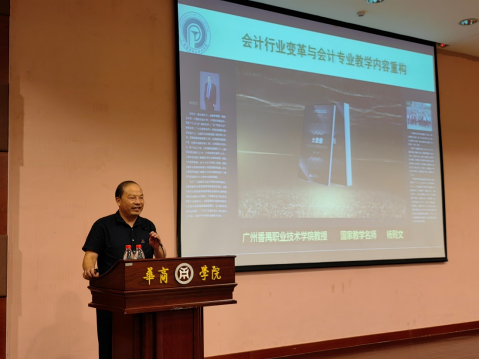 陈美华副校长向国家“万人计划”名师、广州番禺职业技术学院财经学院院长杨则文教授颁发了新伟德国际1946客座教授聘书。聘任仪式后,杨则文教授为我们师生作了题为“会计行业变革与会计专业教学内容重构”的学术报告。