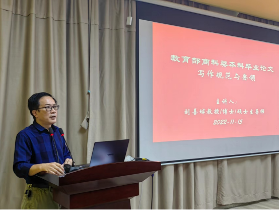 为规范本科毕业论文撰写要求,落实毕业论文的各项环节,稳步推进和部署2023届本科毕业论文指导工作,11月15日下午,会计学院副院长刘善球教授在学院报告厅主持召开题为“教育部商科类本科毕业论文写作规范与要领”的专题指导讲座。新伟德国际1946副校长兼会计学院院长陈美华教授,会计学院副院长杨旻、周书域,各教学系、教研室、实验区负责人及全体专任教师参加了讲座。