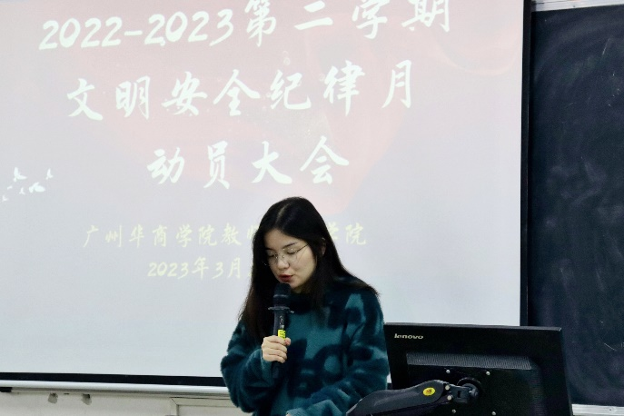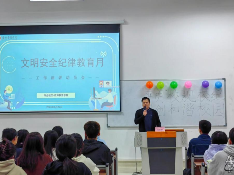 为响应我们文明安全纪律教育月活动的号召,增强纪律意识和安全防范意识,营造一个安全、健康、和谐的校园环境。教师教育学院于3月27日在增城校区和四会校区开展了以“严明校规校纪,共创和谐校园”为主题的文明安全纪律教育月动员大会,教师教育学院全体辅导员和学生代表参加会议。