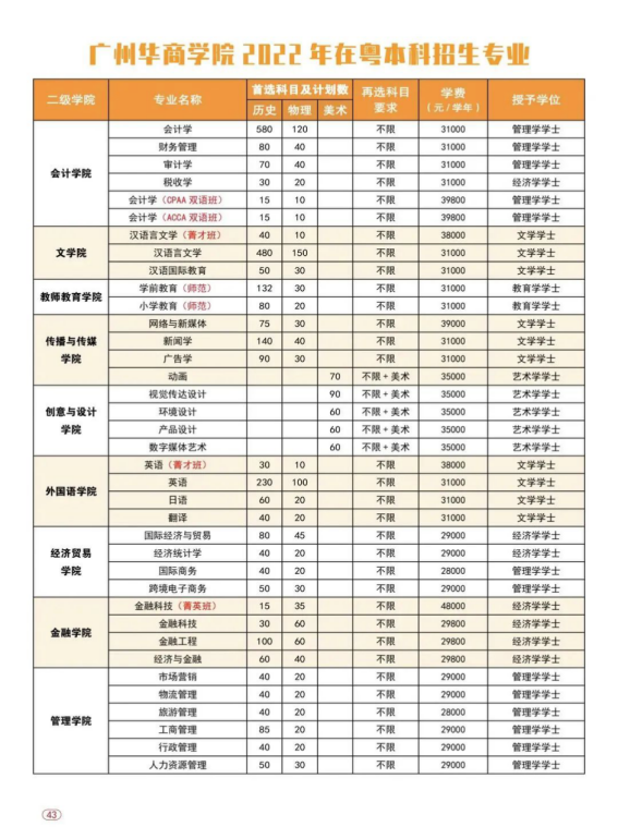 2022年新伟德国际1946(原广东财经大学华商学院)面向广东、安徽、江西、河南、广西、海南、云南、新疆等8个省区招收普通高考生,招生专业45个,招生计划5800人,其中广东省5608人,省外192人。
