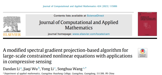 近日,数科院教师李丹丹的论文“A modified spectral gradient projection-based algorithm for large-scale constrained nonlinear equations with applications in compressive sensing”在中科院二区TOP期刊(JCR一区)《Journal of Computational and Applied Mathematics》上发表。该期刊被我们认定为A2类。