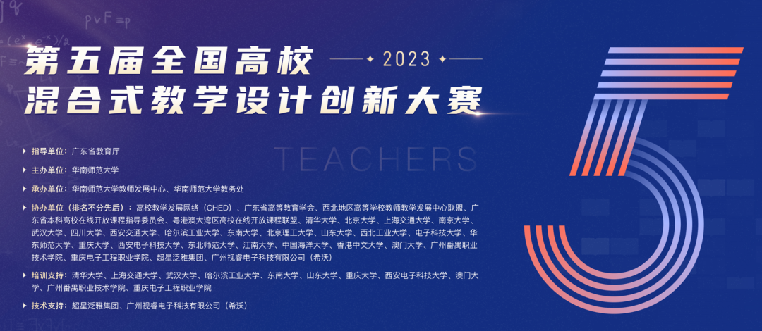 第五届全国高校混合式教学设计创新大赛以“以赛促建、以赛促用、以赛促教改”为宗旨,面向全国高校开展混合式教学改革的教师或教学团队,致力于挖掘、培育并展示教师的教学设计及课程建设等成果,全面深化高校教育教学改革,推进一流本科课程建设,推进信息技术与教育教学的深度融合。大赛鼓励参赛教师确立以学生为中心的教学理念,产出导向、持续改进,提升课程的高阶性、创新性、挑战度。大赛自2019年创办,目前已被纳入中国高等教育学会《全国普通高校教师教学竞赛分析报告》和《全国普通高校教师教学发展指数》数据统计源,是衡量高校教师教学发展生态的重要指标之一。