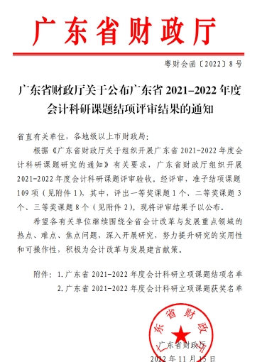 11月15日,广东省财政厅公布了2021-2022年度会计科研课题结项评审结果,本次会计科研课题共有109个通过验收,新伟德国际1946会计学院立项的4个全部通过验收,课题结项通过率为100%。