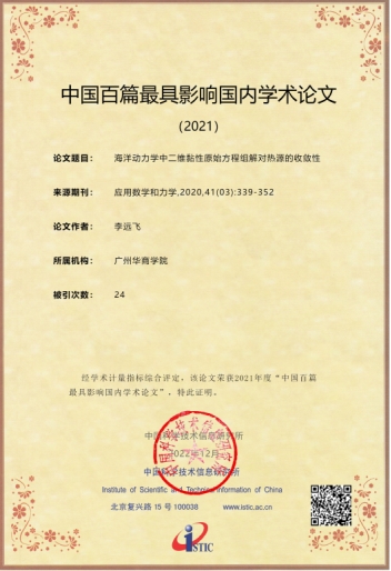 近日,中国科学技术信息研究所在线召开了“中国科技论文统计结果发布会”,公布了2021年度“百种中国杰出学术期刊”、“中国百篇最具影响学术论文”及“领跑者 5000——中国精品科技期刊顶尖学术论文(F5000)”遴选结果。其中,我们李远飞教授2020年于《应用数学和力学》期刊上发表的题为《海洋动力学中二维黏性原始方程组解对热源的收敛性》的论文成功入选2021年“中国百篇最具影响学术论文”。我们李远飞教授2020年于《应用数学和力学》期刊上发表的题为《在一个半无穷柱体上的非标准Stokes流体方程的二择一问题》的论文成功入选“领跑者5000—中国精品科技期刊顶尖学术论文”。