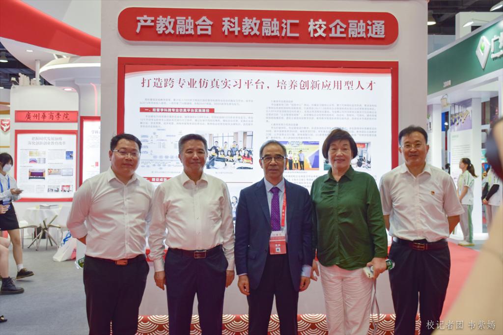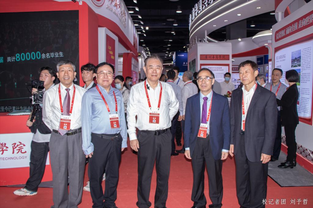 我们应邀参加此次教育博览会,由执行校长郭银华带队,学校相关职能部门一行人出席了本次开幕式和博览会。中国民办教育协会名誉会长李连宁、广东省民办教育协会会长赵康等领导一行来到我们展位,充分肯定了我们近几年的发展成绩以及所取得的成果成效。我们陪同人员向领导、嘉宾们介绍我们展出的学校党建工作、思想政治工作、教育科研工作、国际化办学、创新创业、招生就业等方面的办学成效,并与展会领导、同行专家等进行深入交流。展会现场氛围浓厚热烈。