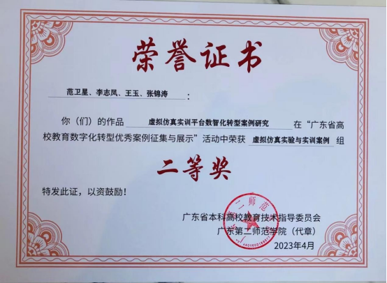 5月5日,由广东省教育厅高教处指导、广东省本科高校教育技术指导委员会主办的“广东省高校教育数字化转型优秀案例征集与展示活动”结果公布,并在韩山师范学院举行“2023年广东省高校教育数字化转型交流研讨会”,会议专门设置了优秀成果展示和颁奖仪式。会计学院专任教师范卫星、李志凤、王玉,合作方金蝶精一公司张锦涛共同撰写的数字化转型案例《虚拟仿真实训平台数智化转型案例研究》荣获二等奖。